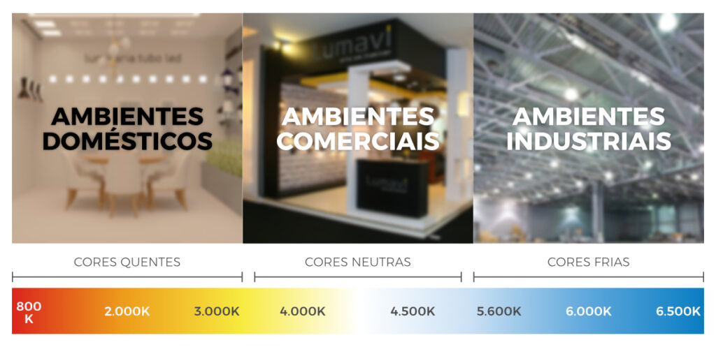 TEMPERATURA DE COR (K): Medida pela unidade Kelvin (K), determina a cor da luz emitida, quanto mais alta a temperatura, mais branco azulada a tonalidade da iluminação, quanto mais baixa, mais branco amarelada será a luz emitida. Podemos encontrar no mercado com facilidade fontes luminosas de 2200K, 2700K, 3000K, 4000K e 6000K.